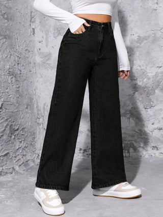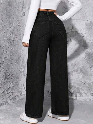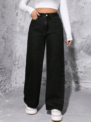 PETITE بنطلون جينز مستقيم للنساء بلون واحد كاجوال