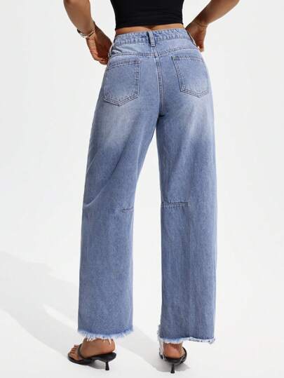 PETITE جينز مستقيم الساق للنساء بنمط كاجوال ومحبوك وحافة خام