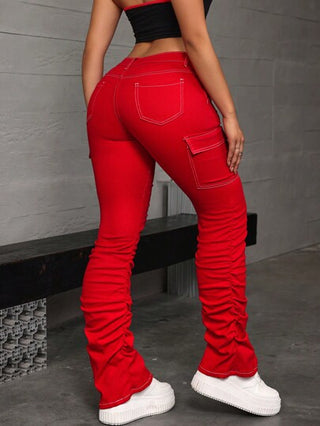 PETITE جينز نسائي بجيوب حمولة ، بخصر عالي ودرزات ، لارتداء كاجوال و عصري