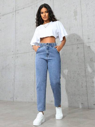 PETITE سراويل جينز كاجوال فضفاضة مستقيمة مع جيوب وخصر مطاطي للنساء