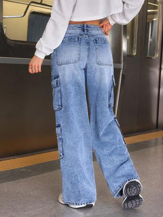 PETITE سراويل جينز كاجوال للنساء مزودة بأزرار أمامية ومتعددة الجيوب