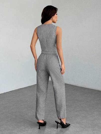 PETITE سروال فضفاض وسترة بدون أكمام مفتوحة من الأمام, مجموعة ملابس
