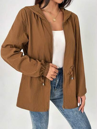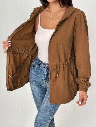 PETITE معطف كاجوال نسائي أكمام طويلة مع قبعة وخيط لتسريب الخصر للخريف والشتاء