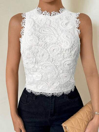 Privé ملابس علوية كامي أنيق أبيض بياقة مستديرة وبلا أكمام وتطريز دانتيل، مناسب للذهاب للعمل، الإجازة، المناسبات الرومانسية والزفاف