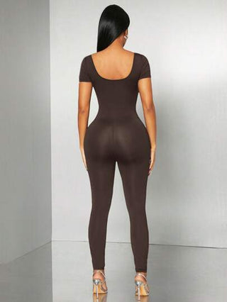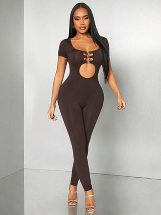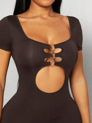 Radiana بدلة تريكو سبرينغ/صيفية أسود داكن مرن و ضامر للعفة، تصميم مرتبط مفرغ وطويل الأكمام بحلقة معدنية، ظهر مفتوح، مناسبة لحفلات الموسيقى والأنشطة اليومية والسهرات والنوادي