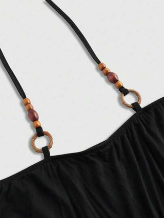 ROMWE Hippie ملابس علوية نسائي أسود أكبر من المقاس مع أكمام رفرفة ذات كتف مكشوف ومزين بخرز خشبي بطراز فنتاج