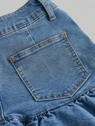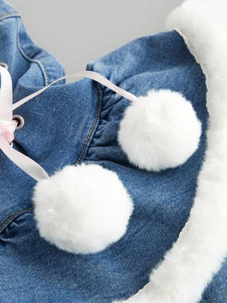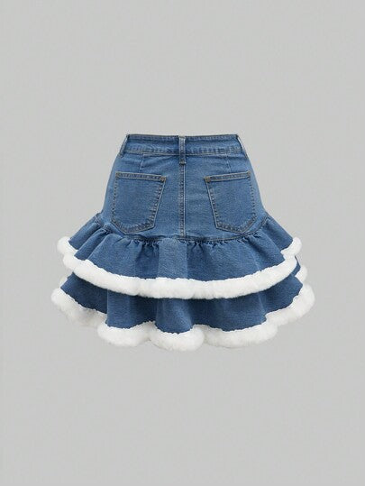 ROMWE Kawaii تنورة جينز قصيرة نسائية مزينة بقصاصات كشكشة ناعمة وشريط ربط وكرة ظرية للشتاء