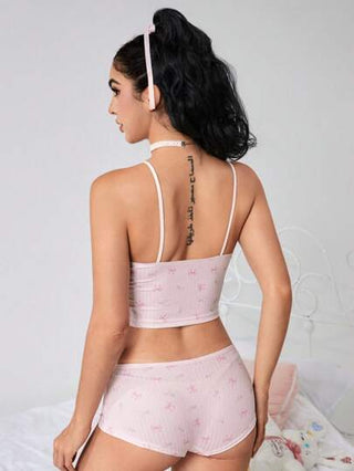 ROMWE Kawaii طقم حمالة ولباس داخلي مطبوع بزهور متنوعة مع تصميم من القفطان الأنيق متموج محبوك بلا أسلاك مزين بفيونكة صغيرة
