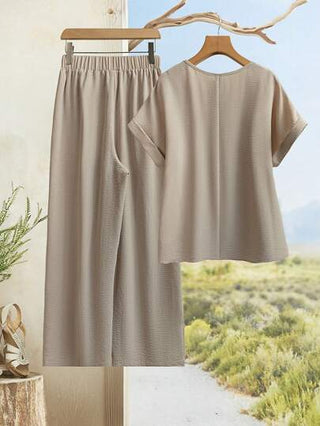 Rusticease طقم بلوزة كاجوال قصيرة الأكمام بلون واحد مع تباين طرف الدانتيل وبنطلون واسع الساق من قطعتين للنساء