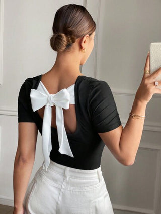 Serisse ملابس علوية T قصيرة الأكمام مطبوعة بالأربطة على الظهر للنساء ذو لون متباين مع ربطة عنق، أسود فضفاض وأنيق، قصير الأكمام ذو فتحة رقبة مربعة ومستديرة, للربيع والصيف