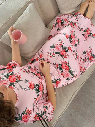 الفستان النوم الطويل بطبعة الأزهار المزججة والذيل المكسّر بالضفائر ذو الأكمام القصيرة ، بموضة أوروبية وأمريكية