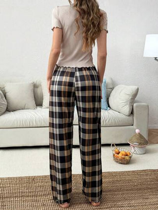 طقم بيجامة للنساء مكون من سروال طويل مربع الطبعة وقميص نصف كم بأزرار أحادية اللون