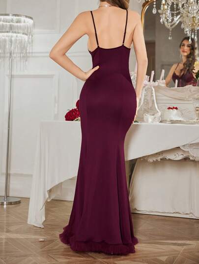 فستان نوم بحزام خصر من القماش الشبكي والتصميم السمكي الطويل، مربوط بحزام خاصرة