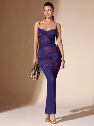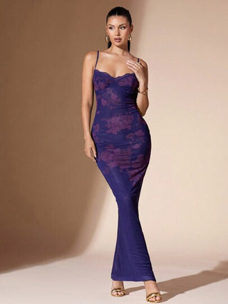 BAE فستان طويل أنيق للنساء، فستان بودي كون ماكسي بشريط دانتيل بنمط الزهور