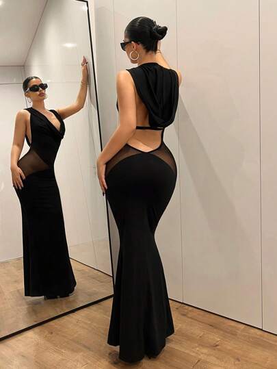 ICON فستان أنثوي أنيق طويل ضيق الصيف أسود جسم كامل بغطاء رأس، ياقة شبك مكشوفة الظهر بخصر شبكي