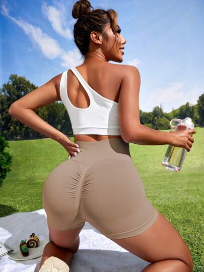 Sport Studio شورت رياضي للنساء مع تصميم احكام الخصر وطيات الخلف، بني اللون، شورت للرياضة والتمارين والدراجات