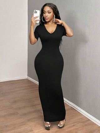 SXY فستان محكم الجسم باللون الأساسي قصير الأكمام بياقة على شكل V للنساء لحفلة التخرج