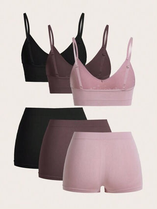 Shein Underwear&Sleepwear Basics مجموعة لانجري سروال داخلي و حمالة صدر إستوائية باللون الصلب بدون درزات يحتوي على 6 قطع