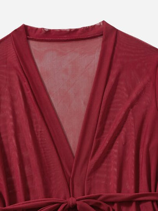 Classic Sexy طقم لانجري بدانتيل شبكي متباين مع روب وحزام - 4 قطع