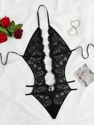 لانجيري حريمي Classic Sexy بدلة تيدي للملابس الداخلية مع تفاصيل قلب مرصعة بالراين والدانتيل الأزهار مفرغة