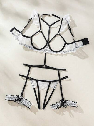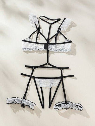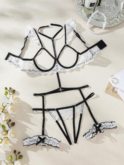 Classic Sexy طقم ملابس داخلية دانتيل زهري حلقة معدني رباط ساق