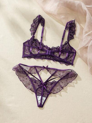 Pure Desire طقم ملابس داخلية شبكة منقط هندسي مقلم دانتيل عقدة الفراشة أمامية حلقة معدني