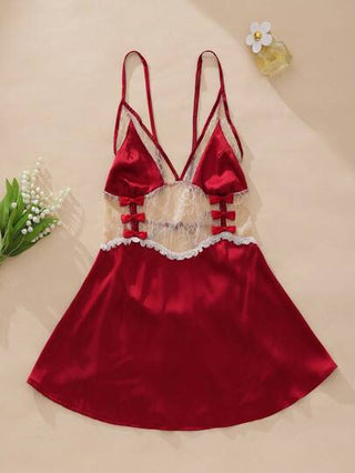 لانجيري حريمي فستان قصير أنيق من الساتان الأحمر الداكن بياقة على شكل حرف V، شفاف مزين بدانتيل بدون ظهر وفيونكة، قابل للتعديل بحمالات رفيعة، ملابس داخلية مثيرة وفستان نوم للنساء/المراهقات