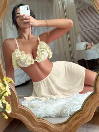 مجموعة لانجري جذابة للنساء بتصميم بمقدمة رباط و زهور ثلاثية الأبعاد