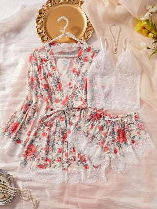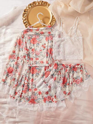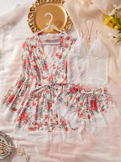 Classic Sexy طقم ملابس داخلية بحزام خصر (4 قطع تشمل صدرية لاسلكية ، سروال داخلي ، رداء ، وحزام الخصر) مطبوع بالورود والدانتيل، ملابس داخلية للسيدات