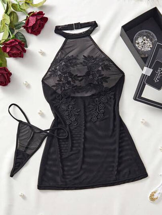 لانجيري حريمي فستان داخلي نسائي جريء برباط خلفي شفاف وقصة عريضة بأزهار 3D مطرزة