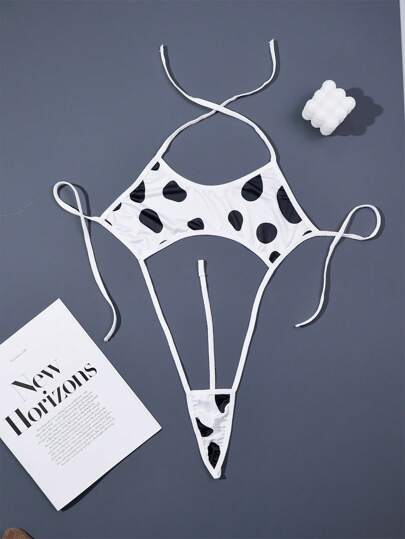 لانجيري حريمي طقم ملابس داخلية لعب الأدوار شباك للساقين، بدلة قصيرة حمالة، بكيني متناسق مربوط بقميص بقرة طباعة مرقطة سيدات جذاب