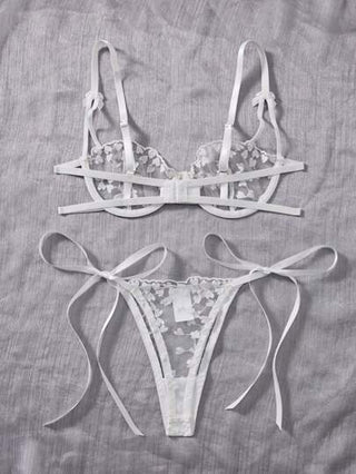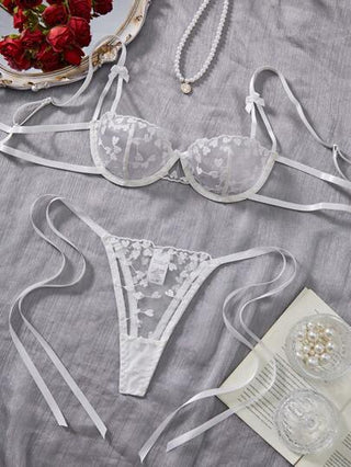 مجموعة ملابس داخلية مثيرة للنساء، حمالة سلكية شفافة مطرزة بالقلب الأبيض قطعتين، ملابس نوم حميمية لعيد الحب، غرفة النوم، ليلة المواعدة