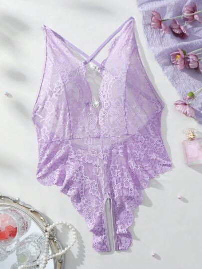 لانجيري حريمي بادي لانجري بتصميم جزئي مفتوح مع حياكة شبكية وزهور