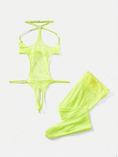 لانجيري حريمي SpicyHot جمبسوت نسائية قصيرة باللون الأخضر الفلوري مفتوحة وجذابة