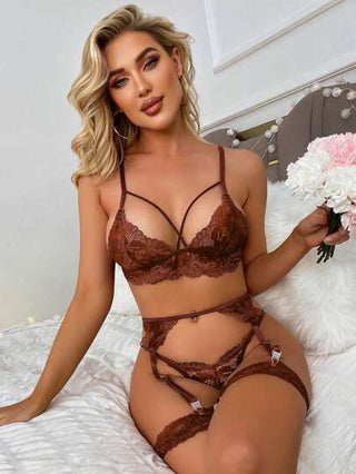طقم ملابس داخلية 4 قطع بما في ذلك صدرية لاسلكية، سروال جي-سترينغ، حامل جوارب، وخواتم الساق
