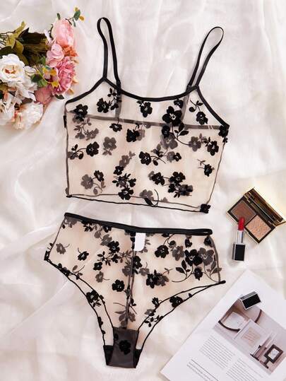 2 قطعة ملابس داخلية نسائية مثيرة، سروال عالي الخصر شفاف مطبوع بزهور والصدرية من شبك بدون سلك، حميمية رومانسية للأزواج