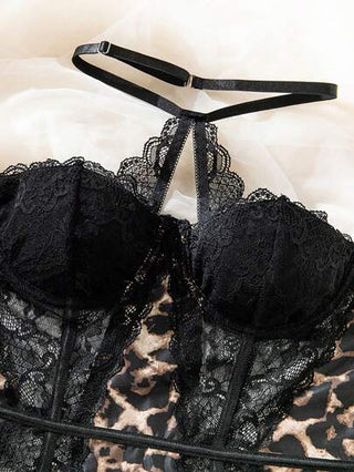 لانجيري حريمي فستان نسائي بحمالات رفيعة من الدانتيل مثير، فستان ضيق مصنوع من طبعة نمر شفاف
