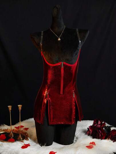 لانجيري حريمي SpicyHot الفستان النوم النسائي ذو الشق الجنبي اللامع والأكمام المفرغة الجذاب