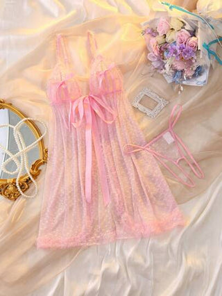 لانجيري حريمي DelicateAllure ملابس نوم نسائية مثيرة من شبكة شفافة ومزخرفة بذيل مكشكش، عقدة وفتحة في المنطقة الحساسة، قطعتين بتصميم بريء ومثير