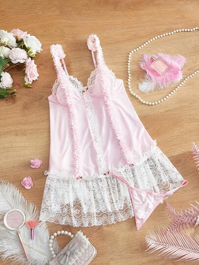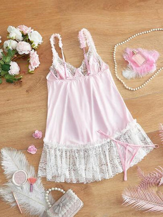 لانجيري حريمي FairyFlirt مجموعتين من قميص النوم الحريمي مزين بالدانتيل الأبيض على قماش قطني وردي، حريمي مثير - قميص نوم + سروال داخلي
