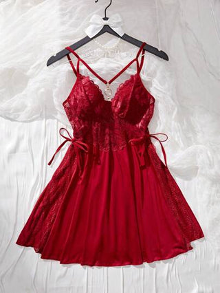 لانجيري حريمي قميص نوم حريري منخفض الرقبة بتطريز دانتيل قطعة واحدة ، فستان شفاف عصري للنساء