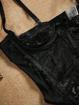 لانجيري حريمي PinupGlam جمبسوت رسمية أنيقة نصف كوب ذات طراز قصر ملكي، رومانسية، مزخرفة بدانتيل ازهار وأهداب شفافة ومقطعة، مدعمة بعظام للنساء، باللون الأسود، مناسبة للحفلات الموسيقية والمناسبات