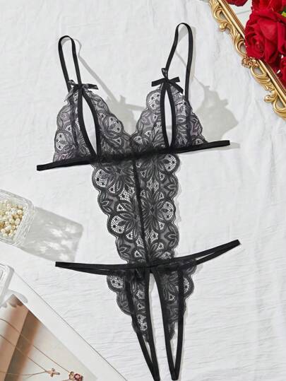 لانجيري حريمي بدلة حمالة جسم من الدانتيل الفاتن، عارية الظهر مع فيونكة، جمبسوت شفاف مفتوح بالمنطقة الحساسة، جمبسوت مكشوف من ثلاث نقاط