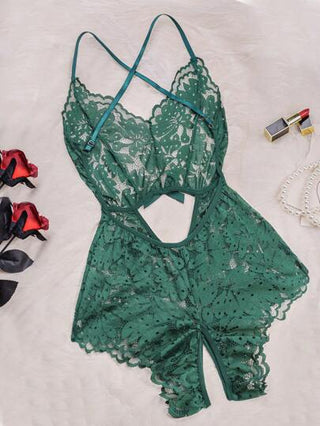 لانجيري حريمي قطعة واحدة ملابس داخلية رومانسية شفافة اللون أخضر مع شرائط دانتيل وظهر مكشوف للنساء