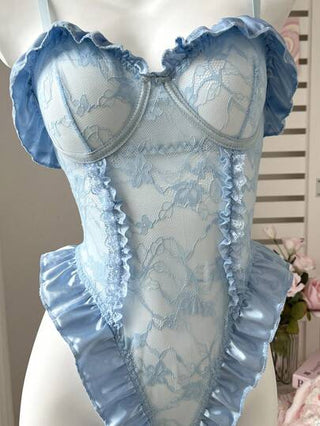 لانجيري حريمي PetitDoll جمبسوت أنيقة نسائية برقبة شفافة، منقوشة بأنماط من الساتان والدانتيل، مزينة بكسرات، ذات طراز أميري أنيق