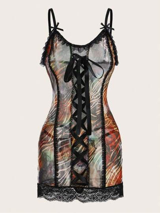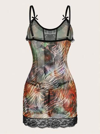 لانجيري حريمي Opulent Queen طقم بيجامة وسروال داخلي 2 قطعة، طبعات هندسية تجريدية على رقبة على شكل وي، شفاف مع دانتيل زهري، رابط خصر ساتان، لون بني وأسود