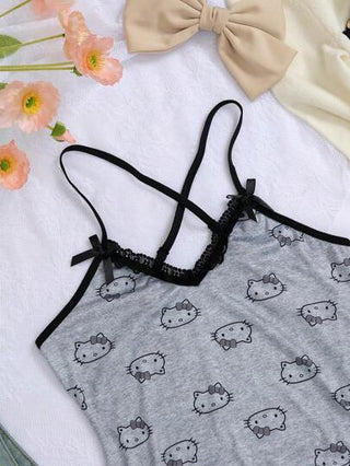 لانجيري حريمي قطعة واحدة بدلة كابوري نسائية بطبعة زهور متعددة الألوان وحزام تصميم صليب ، طبعة هالو كيتي