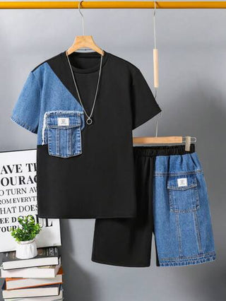 لانجيري حريمي طقم من تي شيرت وشورت للمراهقين الرجال من الدينيم الحديث واللصقات الترقيعية، طقم رياضي بالأسلوب الشارعي الأنيق