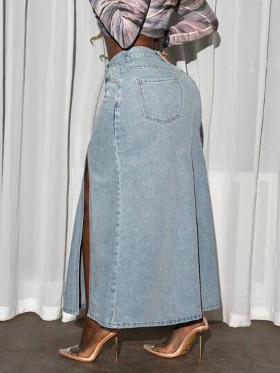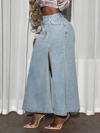 Slaydiva تنورة جينز طويلة مع جيب غير متماثل الخصر و شق في الذيل