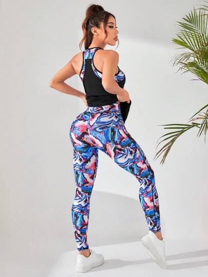 Sport Studio مجموعة رياضية للنساء تشمل: توب بلا أكمام 2 في 1 مزود بوسادة للصدر، مطبوع بطباعة الرسم بالألوان الزيتية، وبنطلون مع جيب من القاع، مجموعة ملابس رياضية للنساء تشمل طقم أساسي وطقم سروال رياضي